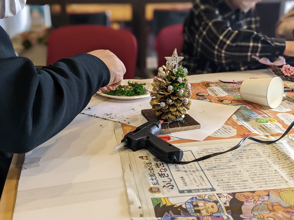 また、恒例の松ぼっくりツリーづくりは今回は特別に大きなクリスマスオーナメントもご用意しました。