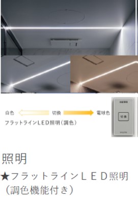 そして爽やかな白色の明かりからくつろぎの電球色の光にその日の気分で変えられるフラットライン照明。